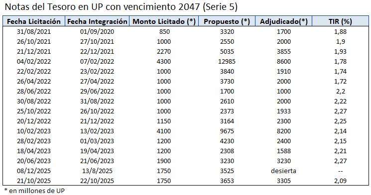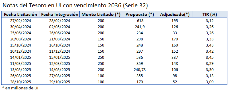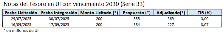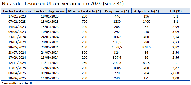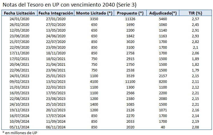 A través del Banco Central del Uruguay, en su calidad de agente financiero del Gobierno, se llevan a cabo las licitaciones locales en el mercado primario de Notas de Tesorería en Pesos Nominales, Unidades Indexadas y Unidades Previsionales.