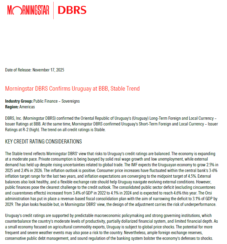 El 17 de noviembre de 2025, la calificadora mantuvo la calificación de la deuda soberana uruguaya en moneda extranjera en BBB, con perspectiva estable. La decisión se basa en políticas macroeconómicas predecibles y en instituciones sólidas, que contrarrestan los moderados niveles de productividad del país, el sistema financiero parcialmente dolarizado y una profundidad financiera limitada.