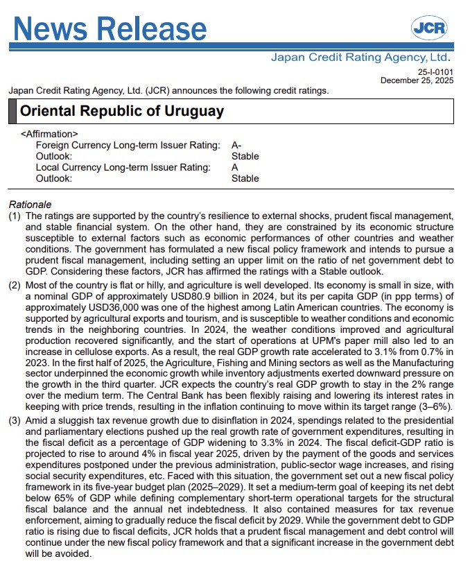 26 de diciembre de 2025. La calificadora JCR mantuvo la calificación de A- para la deuda soberana de Uruguay de largo plazo en moneda extranjera y de A para la deuda soberana de largo plazo en moneda local, con perspectiva estable. Acceda aquí a la versión en japonés del reporte.