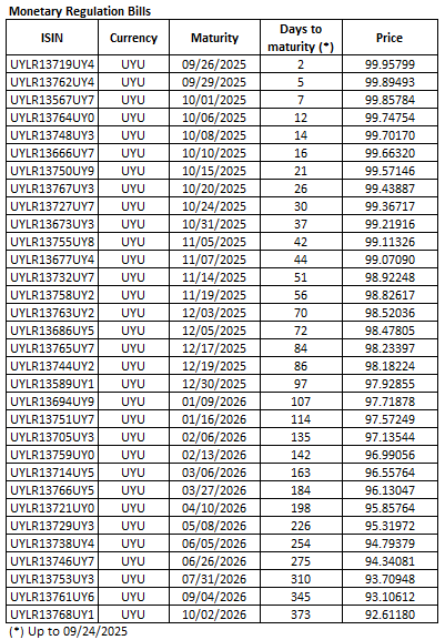 September 24th, 2025. The Republic announces the prices to be paid for the elegible securities in today's Nominal Fixed-Rate Pesos Treasury Notes auction.
