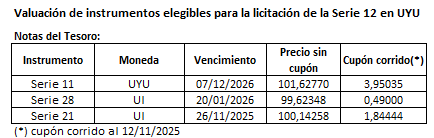Valuación de instrumentos elegibles para la licitación de la Serie 12 en Pesos Nominales (UYU)