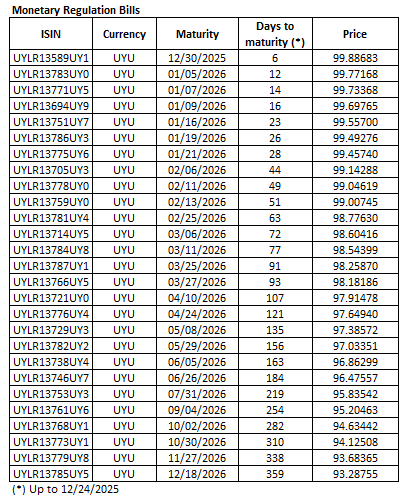 December 23th, 2025. The Republic announces the prices to be paid for the elegible securities in today´s CPI-linked Treasury Notes auction.