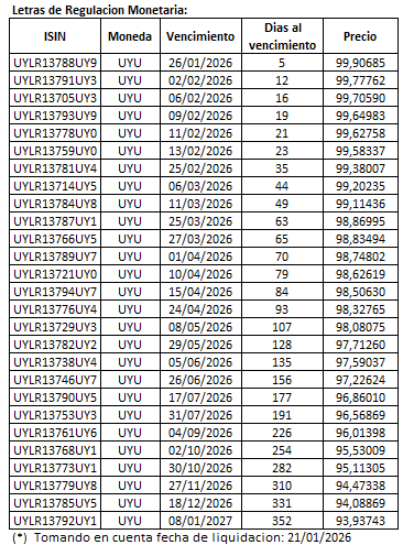 20 de enero de 2026. Se informa la valuación de los títulos elegibles para la licitación de Notas del Tesoro en Unidades Indexadas a realizarse el día de hoy a las 14:00.
