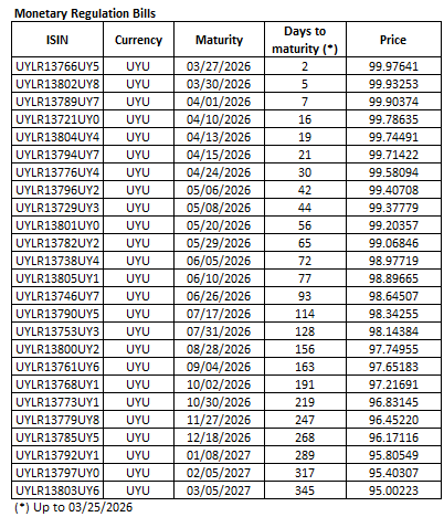 March 24th, 2026. The Republic announces the prices to be paid for the elegible securities in today's Nominal Fixed-Rate Pesos Treasury Notes auction.