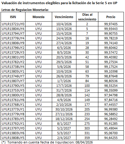 - Valuación de instrumentos elegibles para la licitación de la Serie 5 en Unidades Previsionales (UP)