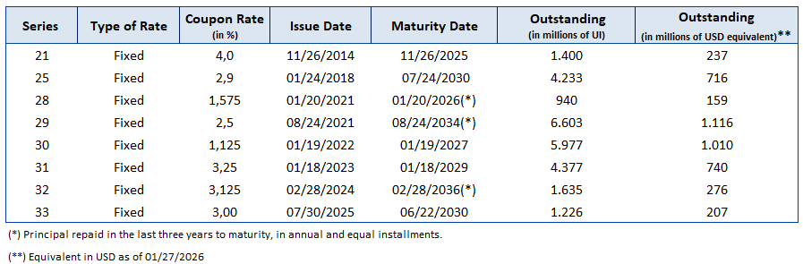 UIs are inflation-indexed monetary units. The UI is calculated by the National Institute of Statistics (Instituto Nacional de Estadistica or INE) and is published monthly in advance for each day from the 6th day of a month to the 5th day of the following month. The UI is available on Bloomberg by typing “URUIURUI <INDEX> <GO>” (or “URUDUD <INDEX> <GO>”. The UI changes on a daily basis to reflect changes in the consumer price index (Indice de Precios al Consumo or IPC), which is measured by the INE. The UI for each day is set in advance based on changes in previous months’ inflation.