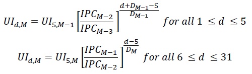 where UId,M corresponds to the value of the UI on day d and month M, DM corresponds to the number of days in month M, IPC M corresponds to the value of the IPC on month M and, in consequence, the coefficient between IPC M-1 and IPC M-2 corresponds to the inflation rate of the previous month. The index was created with an initial value of 1.0 on June 1st 2002 and was subsequently adjusted to 1.2841 on August 1st 2003.