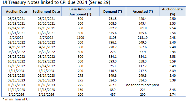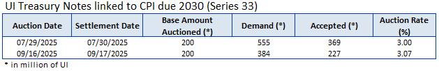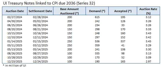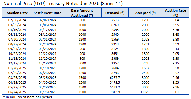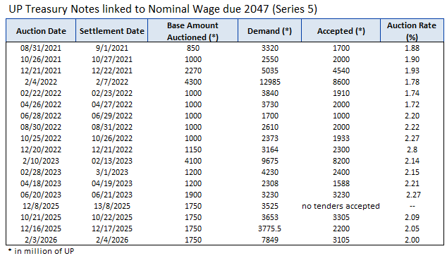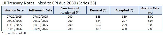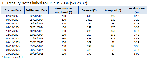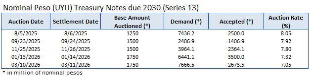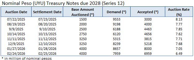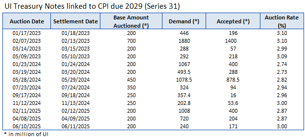 Through the Central Bank of Uruguay as its financial agent, the Government conducts local auctions in the primary market for Nominal Peso, CPI-linked and Nominal Wage-linked Treasury Notes.