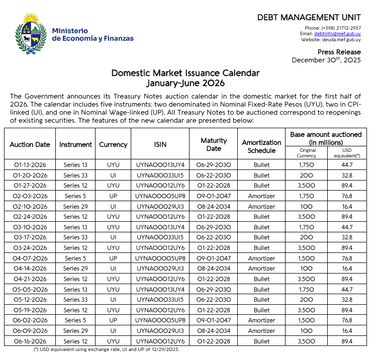 December 30th, 2025. The Government announces the domestic issuance calendar of local currency Treasury Notes for the next six months. It will continue issuing Nominal Fixed-Rate Pesos, CPI-linked and Nominal Wage-linked securities across different maturities. Also, it will continue allowing Central Bank Monetary Bills as eligible securities for tender, as detailed in the Press Release.
